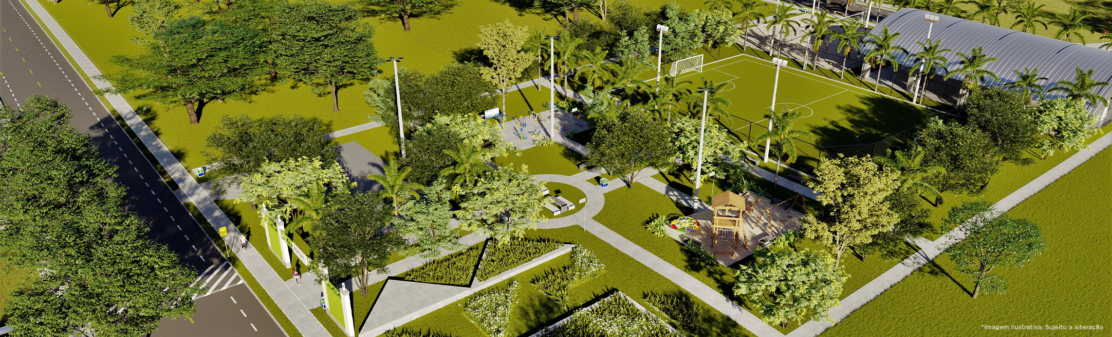 Este novo loteamento com 124 mil m² de área verde, integra o projeto de bairro aberto com lazer de parque completo, Jardineiras com bancos, Praça EMAIS com espaço aberto para recreação, academia ao Ar Livre, Playground, Mini Campo de Futebol, Quadra Poliesportiva Coberta, duas Quadras de Beach Tennis e Pista de Cooper interligando todo o empreendimento, tudo isso numa área de aproximadamente 13 mil m².