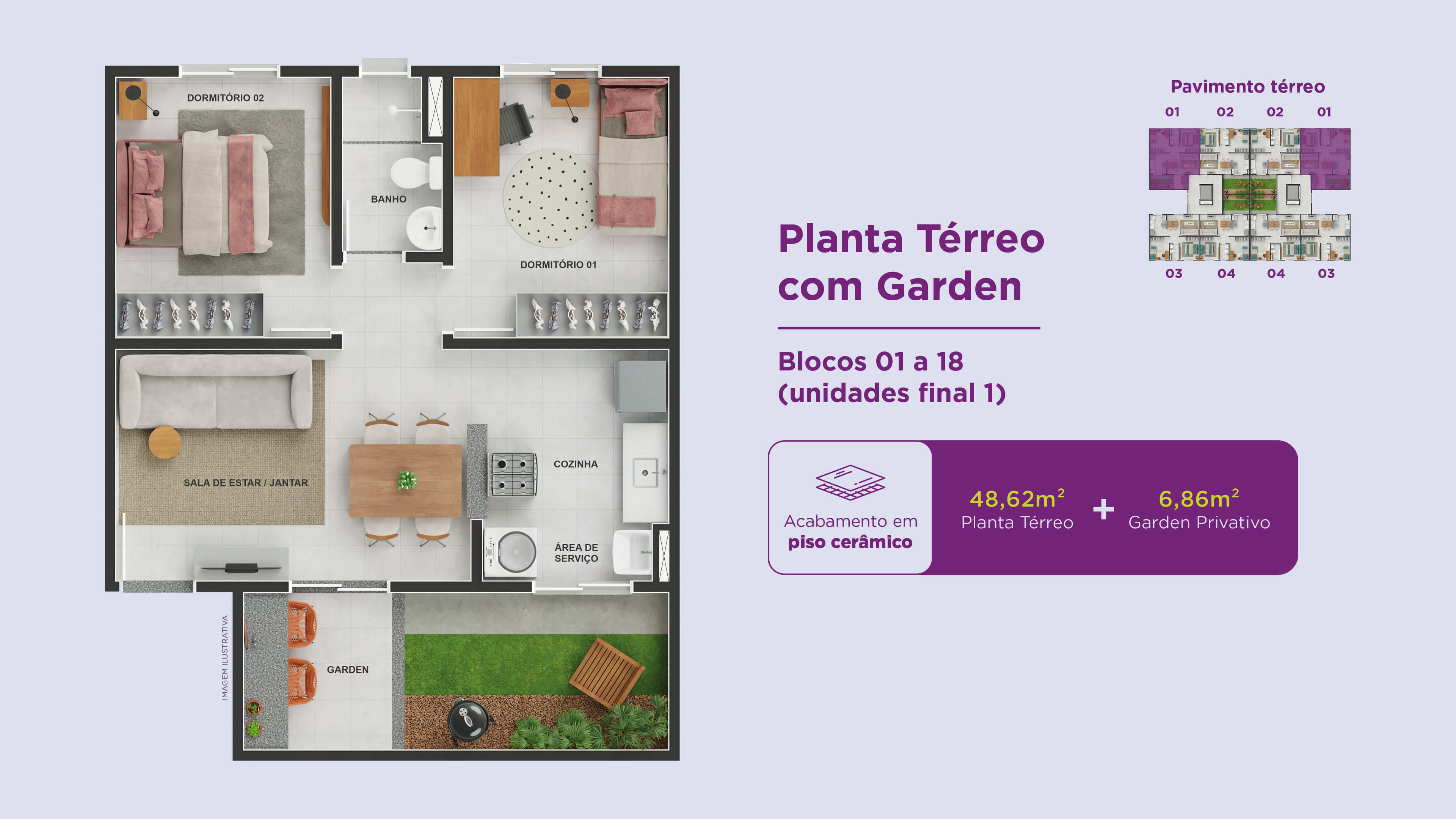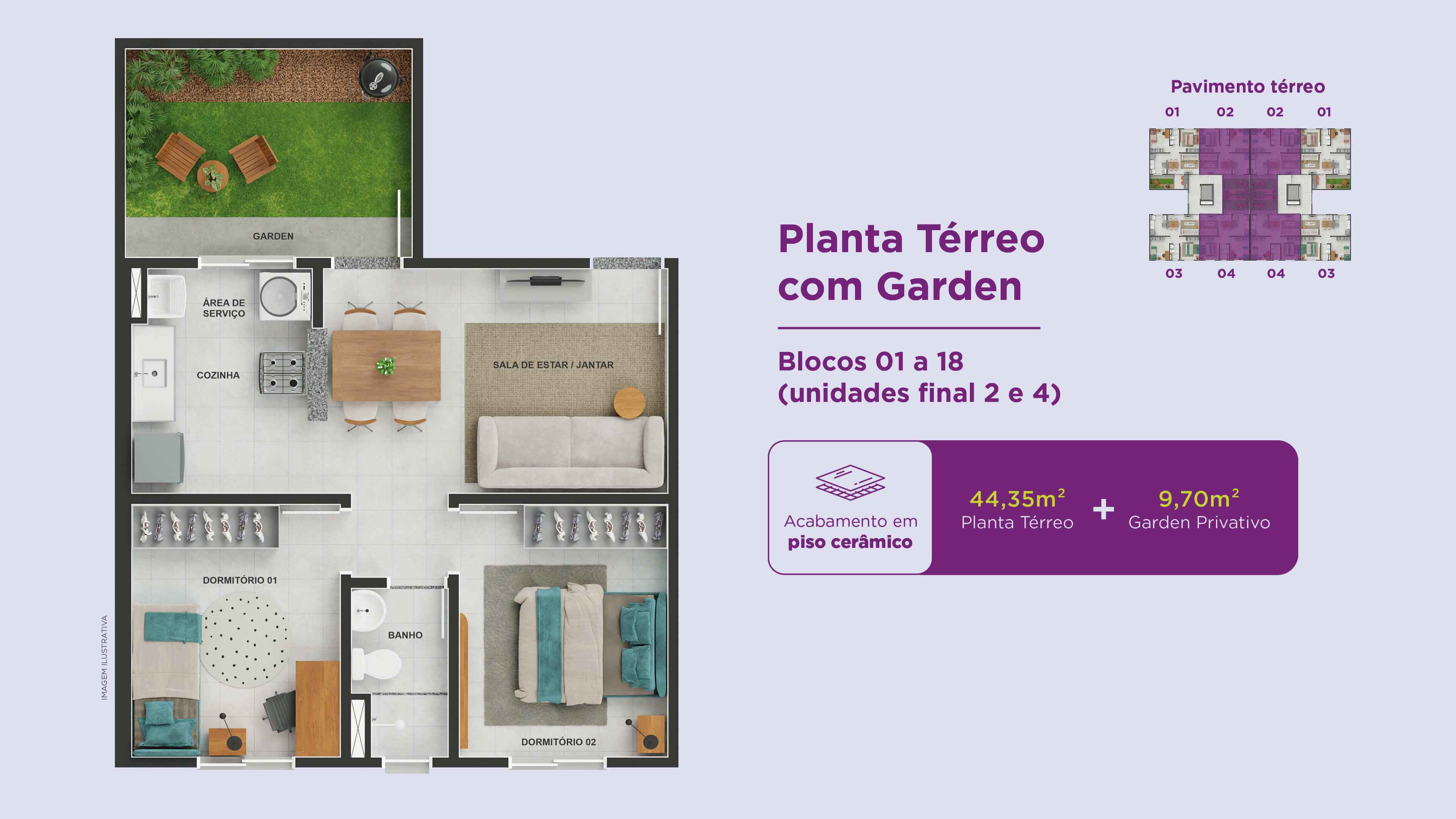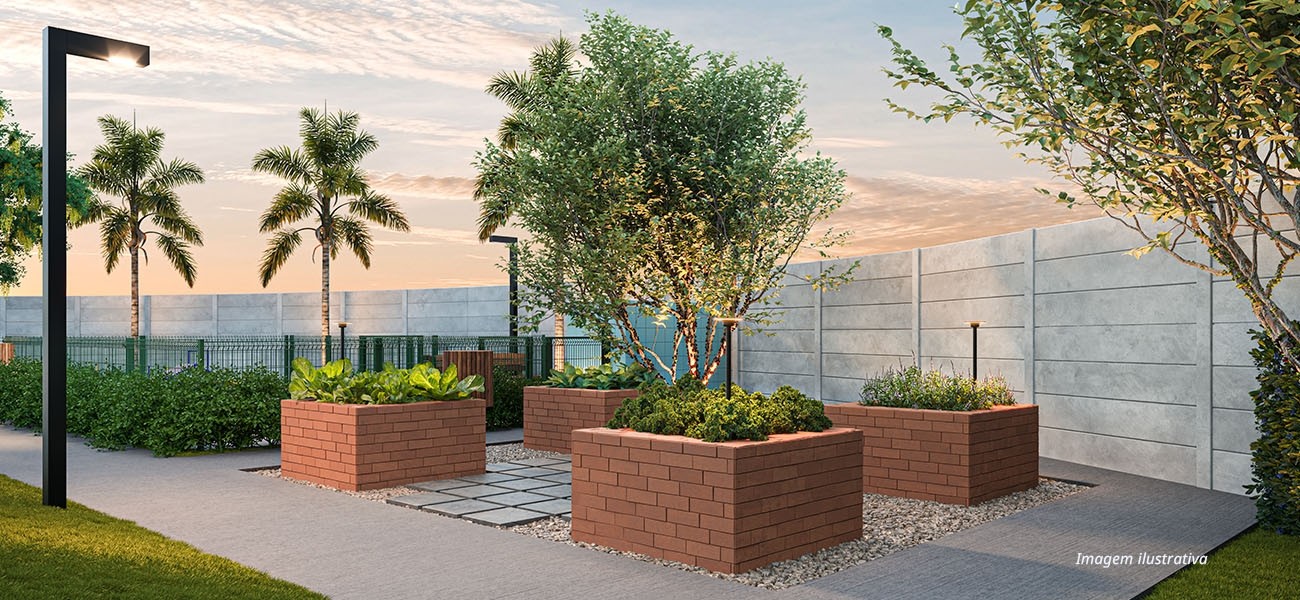 São mais de 400m² de lazer completo, com quiosques c/ churrasqueira, piscinas adulto e infantil, quadra de beach sports, redário, playground, salão de festas, horta comunitária, pet place, espaço para mini mercado, espaço bricolagem, car wash, espaço das frutas, espaço piquenique e muito mais! Além de mais de 3 mil m² de áreas verdes desenvolvidas para aproximar o contato dos moradores com a natureza e o bem-estar.