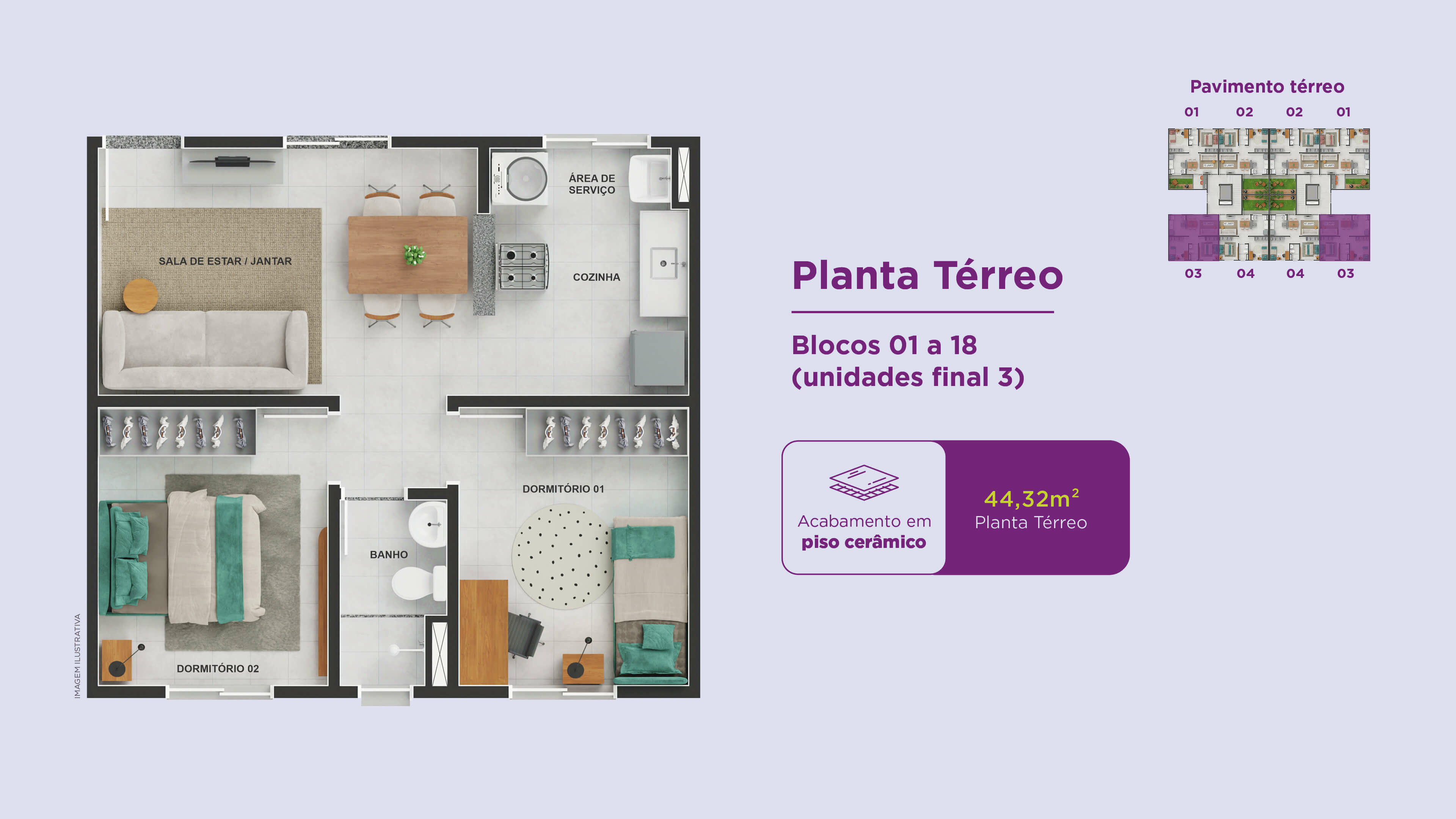 Fale com um corretorEmpreendimento “RESIDENCIAL ECOVIVA VISTA BELA”, registrado junto à Matrícula nº 208.847 do 1º Registro de Imóveis de São José do Rio Preto/SP, sob o nº R.4/208.847, na data de 17/03/2023, nos termos da Lei Federal nº 6.766/79. O imóvel está sujeito à análise de crédito da instituição financeira, de acordo com as regras dos Programas Habitacionais praticados dentro do SFH (Sistema Financeiro de Habitação), inclusive do Programa Minha Casa Minha Vida, instituído pela Lei Federal nº 14.620, de 13/07/2023, com a possibilidade de aquisição sem entrada, desde que a renda familiar seja de até R$ 3.600,00 (três mil e seiscentos reais) para unidades habitacionais avaliadas pela CAIXA pelo valor de R$ 239.000,00 (duzentos e trinta e nove mil reais). Nesta condição, poderá haver bonificação de até R$ 39.100,00 (trinta e nove mil e cem reais) pela Emais Residências. Em caso de renda familiar de até R$ 1.600,00 (um mil e seiscentos reais), o subsídio poderá ser de até R$ 55.000,00 (cinquenta e cinco mil reais). Tudo em conformidade com as normas da CAIXA ECONÔMICA FEDERAL, com créditos obtidos por meio do novo Programa Minha Casa Minha Vida. As unidades disponibilizadas, valores e condições são passíveis de alteração sem aviso prévio. As imagens e perspectivas são meramente ilustrativas, podendo ser alteradas sem prévio aviso. O memorial descritivo poderá sofrer alterações de acordo com eventuais necessidades.